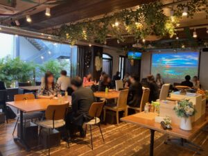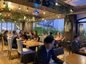今回のパーティーは原宿駅から徒歩2分のBlue Gardenにて開催いたしました。都会の中心にありながら、豊かな緑に囲まれた開放的なテラスが魅力の会場です。